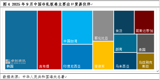 综合来看,2025年9月中国冷轧板卷进口同环比有一定差异性表现,出口同环比均有所增加,9月中国冷轧板卷净出口量为23.47万吨,较上月略有增多,较去年同期增量较为明显。1-9月净出口量合计170.56万吨,较去年同期的147.43万吨增加了23.13万吨,增幅15.69%。从净出口数据上看,今年1-9月份累计外需表现扩增较多,一定程度对国内冷轧板卷市场有利多支撑。对于未来市场来看,国内促进内需的主题不变,内需扩张依旧是冷轧板卷市场需求的主要阵地,但出海亦是冷轧板卷寻找需求增量的重要支点。就中国冷轧板卷在国际的认可度不断提升来看,未来出口面对冷轧板卷的利多支撑亦可期待。
