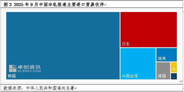 根据中华人民共和国海关总署数据显示,9月中国冷轧板卷进口贸易伙伴增加至29个,较上月增加了4个,但主要进口贸易伙伴集中度有所提高。其中韩国、日本、中国台湾、瑞典和德国是中国冷轧板卷进口排名前5的主要贸易伙伴,与上月相比,中国进口前五的贸易伙伴保持不变。9月来自韩国的冷轧板卷在中国冷轧板卷进口贸易伙伴中占据首位,9月进口3.60万吨,占进口总量的比例为66.55%,较上一期占比提高了8.05个百分点。其次是日本,进口0.96万吨,占比为17.73%。排名第三的是中国台湾,进口量0.53万吨,占比7.65%。排名前三的贸易伙伴进口量占比合计94.17%,较上期提高1.97个百分点。进口伙伴的变化情况来看,中国进口较多的贸易伙伴排名稳定,进口贸易伙伴总体数量增加,头部集中度显著提高,亚洲区域的进口资源占据主导。