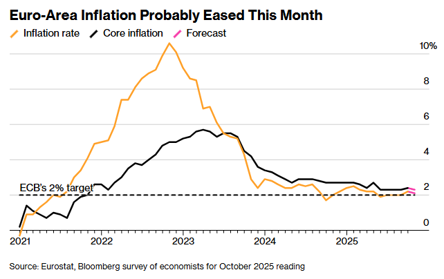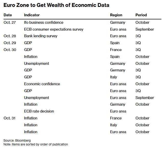几乎同样重要的是次日将公布的欧元区10月份通胀数据,预计通胀率将从9月的2.2%降至2.1%。欧洲央行还将发布银行信贷调查,这有助于评估货币政策向实体经济的传导顺畅程度。