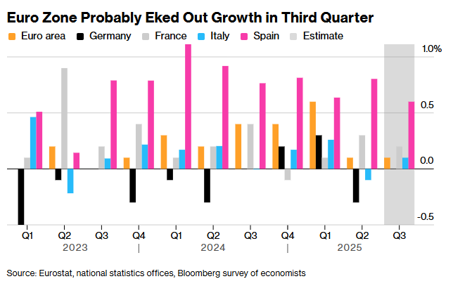在欧洲央行政策制定者将开会讨论利率之际,本周欧洲将迎来一次严格的经济健康检查,这有助于评估美国关税对经济增长和通胀的影响。重头戏将是周四公布的欧元区第三季度GDP初值。该数据发布几小时后,欧洲央行将揭晓为期两天的货币政策会议结果。分析师预计,欧元区第三季度将维持0.1%的微弱增长。该地区部分主要经济体的经济报告将提供更多细节。