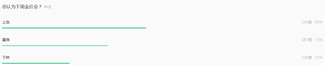 10月20日当周,伦敦金价格开盘4264.63美元/盎司,最高4381.62美元/盎司,最低4004.18美元/盎司,收盘4113.08美元/盎司。市场人士认为本周国际金价震荡偏空可能性较大。投票显示,有45%的读者看涨本周金价、33%看震荡、21%看空。