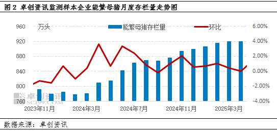 从能繁母猪配种到产出可出售的商品仔猪,总时长约为 5个月,上一年度12月至本年度2月的能繁母猪存栏量直接关系到三季度的仔猪供应量。据卓创资讯统计,2024年12月到2025年2月样本企业能繁母猪存栏量逐步增加,增幅分别为0.58%、0.71%和1.07%,产能的不断提升直接提升了三季度的仔猪供应量。更关键的是,能繁母猪生产效率的提升进一步放大了供应弹性,多数集团企业PSY已达27头以上。这使得在能繁母猪存栏量较高的情况下,仔猪的产出数量有所提高,进一步加剧了仔猪市场的供应过剩。
