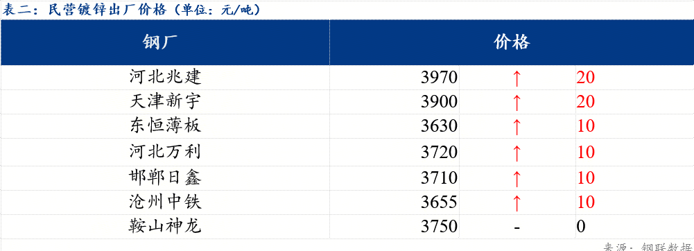 今日北方民营钢厂镀锌出厂指导价在3630-3970元/吨。