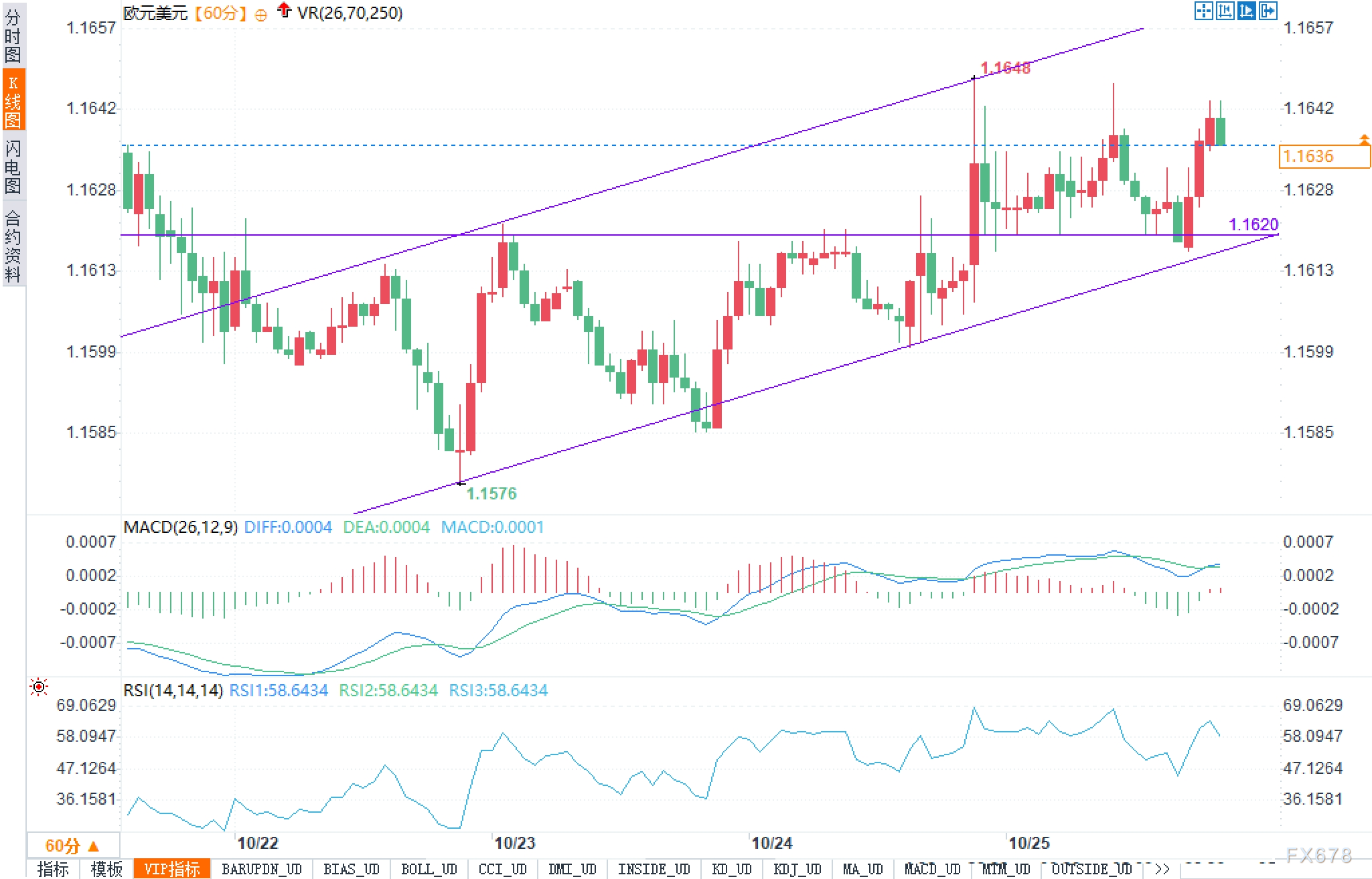 60分钟图显示,欧元兑美元自1.1576启动的上升通道保持完好,当前价位处于通道中轨上方。1.1620一线多次被验证为短线支点;上沿约1.1655附近(前高1.1648)存在压制,长上影反映上攻动能受限。