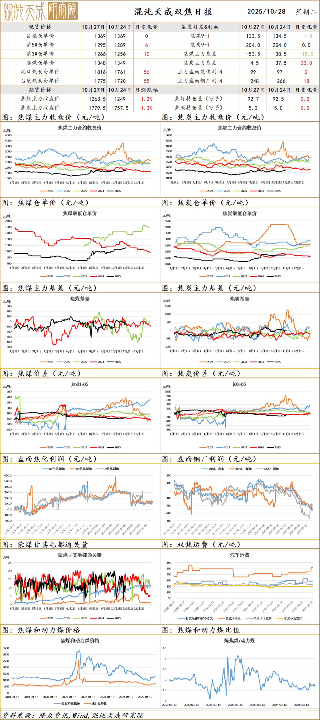 2.中国煤炭资源网冶金部10月27日重点关注:焦炭市场继续偏强运行,由于原料煤涨势长期快于焦炭,焦企成本倒挂范围逐渐扩大,西北地区已有部分企业主动降低负荷,焦炭产量不同程度下降。需求方面,河北区域钢厂虽在环保干扰下有减产,但持续时间比较短,部分钢厂库存尚未补足还在加量采购中。整体来看,当前焦炭供需结构仍然偏紧,后续还需关注钢厂减产进度以及成本支撑会否进一步加强。焦煤方面,近日主产地煤矿换工作面情况较多,且环保和安监严格,供应恢复相对缓慢,供应端仍偏紧张。需求方面,焦炭第二轮即将全面落地,继续提振市场情绪,下游焦企采购积极,煤矿订单情况良好,普遍维持低库存状态,价格仍以上涨为主,短期内市场延续偏强运行,后期关注动力煤价格走势和产地供应情况变化。进口蒙煤方面,甘其毛都口岸通关延续偏低水平,口岸现货资源紧张,贸易商报价高位,但下游接受度有限,价格震荡运行,蒙5#原煤价格暂稳在1110-1130元/吨左右。