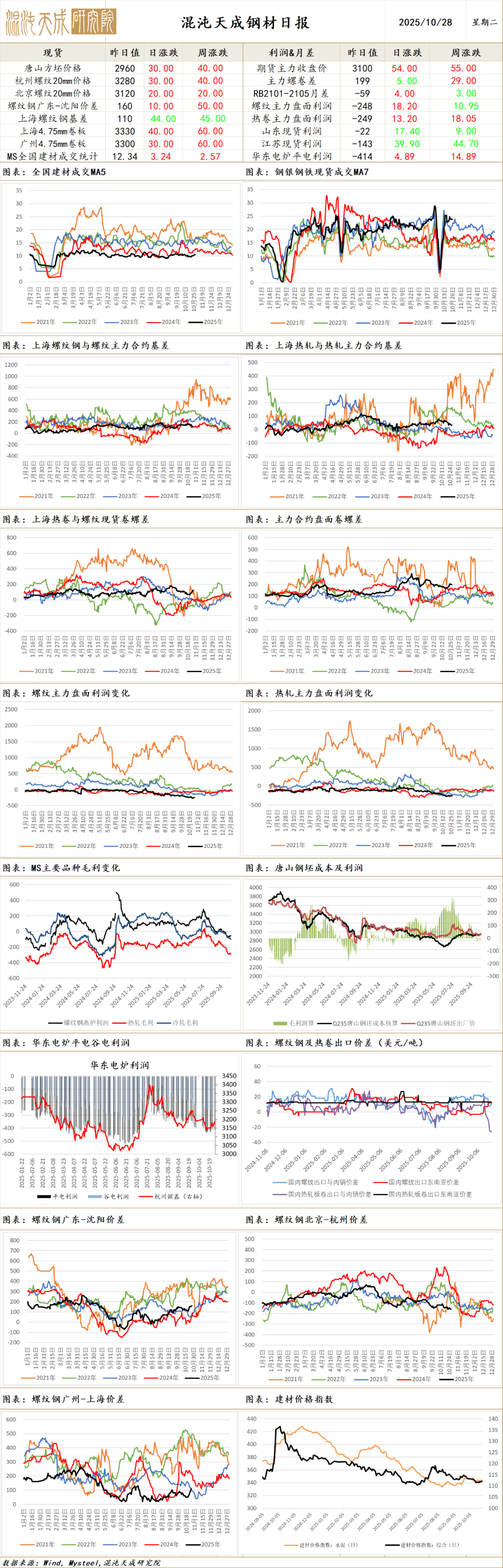 需求端,钢银周一数据显示各品种钢材均有减量,总库存继续下降。上周机构数据均显示钢材厂库、社库延续下降,总库存有所减少,其中建材库存降幅较板材更大,且各品种钢材表需多有回升。另据百年建筑调研,上周全国水泥出库量261.6万吨,环比上升3.5%,基建水泥直供量环比上升1.9%;混凝土发运量为144.87万方,环比减少3.21%;样本建筑工地资金到位率59.62%,周环比上升0.18个百分点,显示当前建筑下游需求依然喜忧参半。海外方面,尽管美国政府停摆延续,但随着近期中美关系缓和,贵金属大幅回落,外盘商品则多表现上涨。国内方面,潘行长在最新召开的融街论坛年会上表示恢复公开市场国债买卖操作,并将研究实施支持个人修复信用的政策措施,计划明年初执行,显示国内货币政策有望进一步向好。进出口方面,昨日国外主要地区钢价普遍持稳,但因前期国内钢价走弱,近期国内外冷热卷价差有所扩大,国内钢材出口仍有空间,SMM最新调研显示上周出口商订单环比增长。