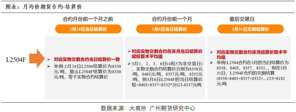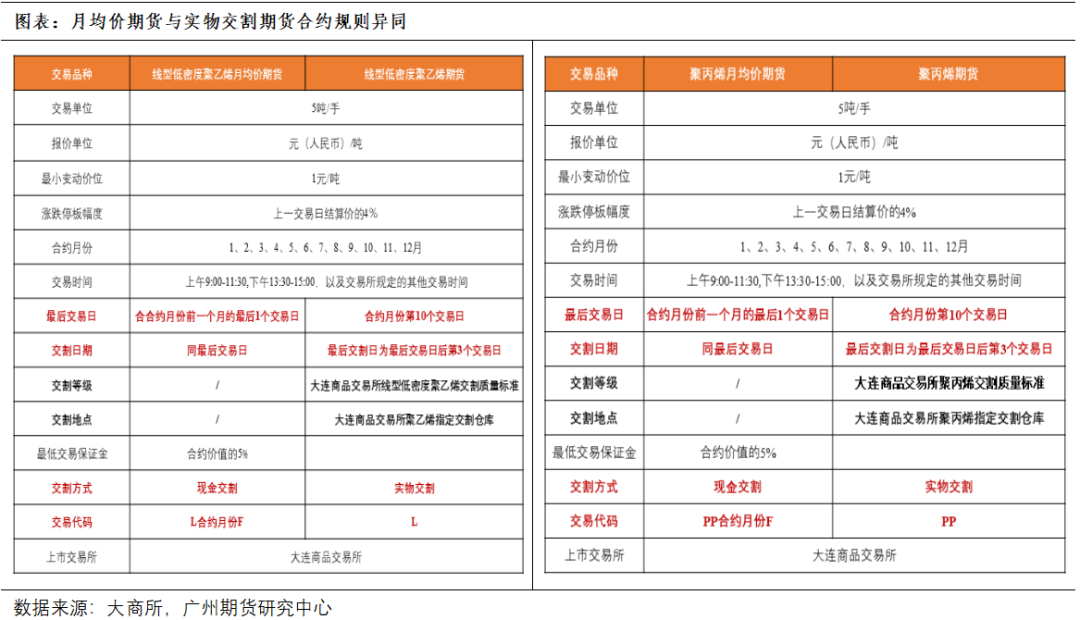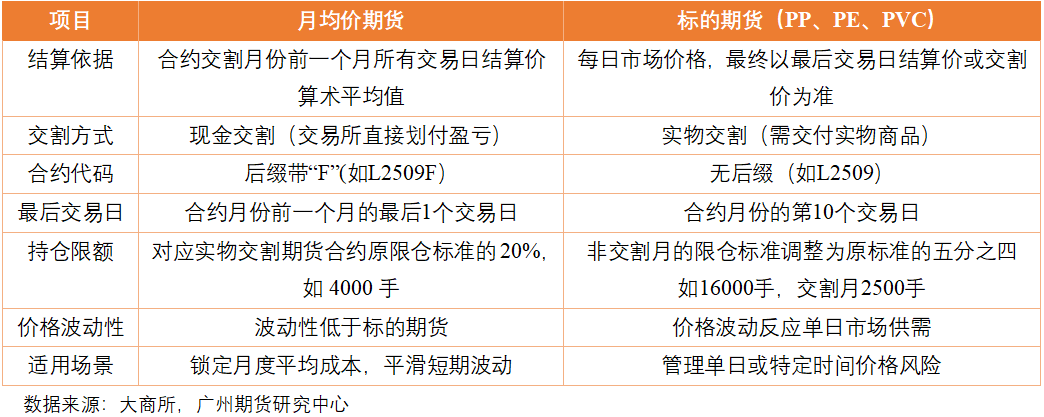 月均价期货是大连商品交易针对聚乙烯(LLDPE)、聚氯乙烯(PVC)和聚丙烯(PP)所推出的创新产品,三个化工品月均价期货是以线型低密度聚乙烯期货、聚氯乙烯期货和聚丙烯期货结算价的月算术平均值为交割结算依据,通过现金交割了结到期未平仓合约的期货品种,交易代码分别为“L合约月份F”、“V合约月份F”、“PP合约月份F”。线型低密度聚乙烯月均价期货首批上市交易合约是L2602F、L2603F、L2604F;聚氯乙烯月均价期货首批上市交易合约是V2602F、V2603F、V2604F。聚丙烯月均价期货首批上市交易合约是PP2602F、PP2603F、PP2604F。每月最后1个交易日闭市后,基于月均价期货已上市最远月份的合约,增挂下一月份的月均价期货合约。如2025年10月31日闭市后增挂L2605F、V2605F、PP2605F合约。