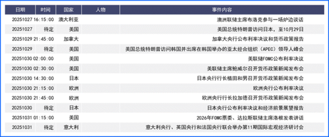回顾上周,美元指数和大部分非美货币均维持窄幅震荡,展现出在本周美联储利率决议公布前的交投谨慎氛围。展望本周,美联储、欧央行、日央行同日公布利率决议,APEC峰会聚焦亚太合作新路径。与此同时,美国政府停摆导致的核心通胀数据发布悬念,数据真空与政策博弈的交织很可能加大市场波动。值得投资者重点关注。