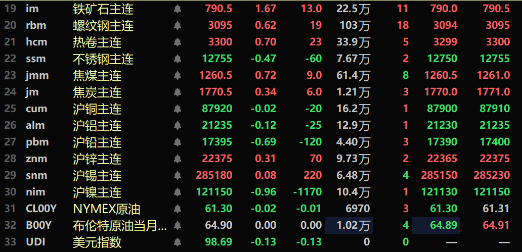黑色系普涨,铁矿涨1.67%,螺纹涨0.62%,热卷涨0.7%,不锈钢跌0.47%。双焦方面:焦煤主力合约涨0.72%,焦炭主力合约涨0.34%。