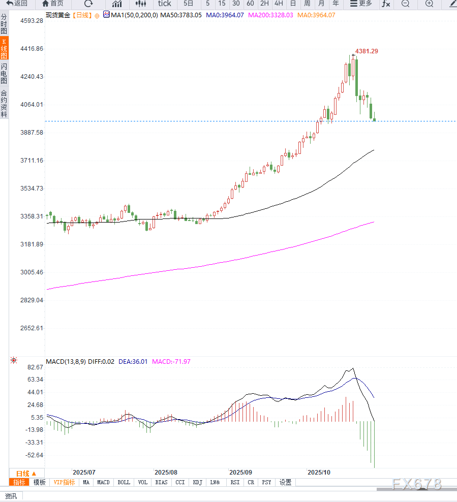 若金价持续承压并跌破3950美元支撑,则或引发进一步抛压,目标指向3900美元(对应7月至10月涨势的50%回撤位)。
