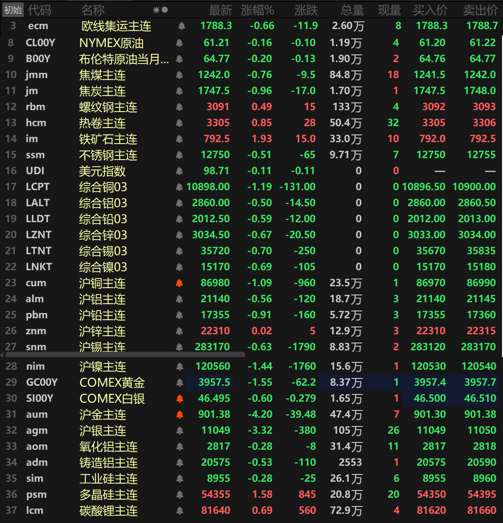 此外,碳酸锂主连涨0.69%,多晶硅主连涨1.58%,工业硅主连跌0.28%。欧线集运主连跌0.66%,报1788.3。