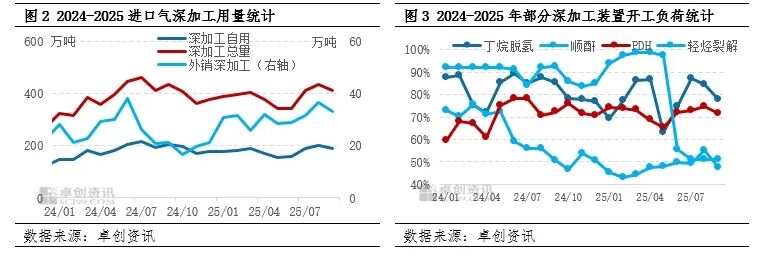 根据卓创资讯数据统计,2025年9月主力深加工装置开工负荷呈现下降趋势,其中顺酐装置开工负荷下降7.17个百分点,PDH装置开工负荷下降2.95个百分点,丁烷脱氢装修开工负荷下降6.97个百分点。深加工需求小幅下降,整体需求较上月减少12万吨,同比下降5.28%。