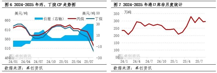 沙特阿美公司9月CP公布,丙、丁烷均较8月持平,丙烷为520美元/吨,丁烷为490美元/吨。丙烷折合到岸成本预估在4440元/吨左右,丁烷折合到岸成本预估在4165元/吨左右。CP公布价格基本符合市场预期,合同户采购成本下滑明显,但由于8月下旬,市场买兴提升,现货成交贴水上涨明显,成本也随之增加,综合来看,本月上旬港口库存仍维持310万吨以上的高位水平,但后期随着进口到岸成本增加,进口贸易商多以消耗国内库存为主,导致月底期末库存较上月同比下滑明显。