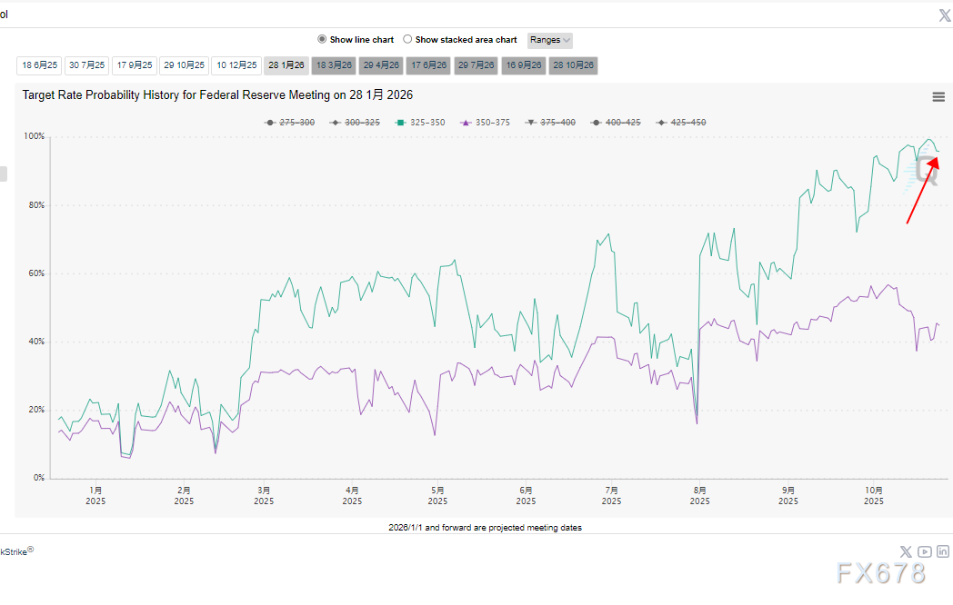 从预期来看,芝商所(CMEGroup)美联储观察工具显示,交易员已完全消化美联储在周三会议落幕时降息25个基点的可能性,且对12月再度降息的预期也在逐步升温。这一预期的形成,与上周五公布的美国通胀数据密切相关——9月整体消费者物价指数(CPI)与核心物价指数(剔除食品和能源)同比均上涨低于市场预期的3.1%,印证了通胀压力温和、为降息提供空间的判断。