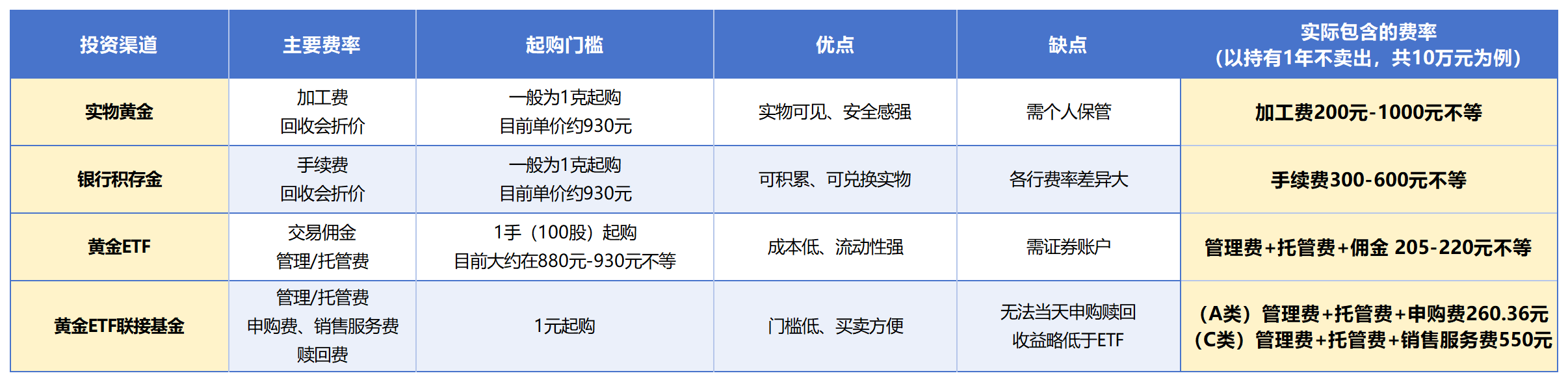 假设使用10万元资产购买黄金,购买黄金ETF的费率最低,最低仅需205元;而购买实物黄金的费率相对较高,若投资者选择了加工费较高的商家,最高成本可达1000元。