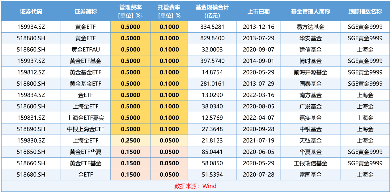 从成本结构上来说,黄金ETF相对透明:主要包括了基金管理费+托管费+券商交易佣金。目前,主流黄金ETF的年管理费多在0.15%至0.50%之间,托管费约0.05%。