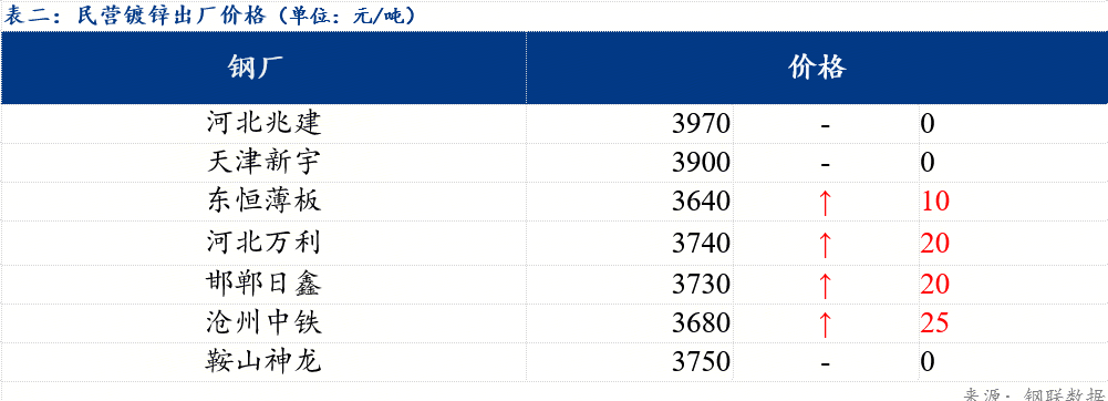 今日北方民营钢厂镀锌出厂指导价在3640-3970元/吨。