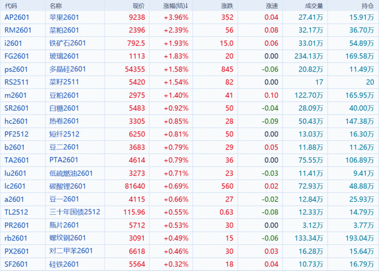10月28日,午市收盘,国内期货主力合约涨跌不一。苹果涨近4%,菜粕涨超2%,铁矿石、玻璃、多晶硅、豆粕涨超1%。跌幅方面,沪金跌超4%,沪银跌超3%,丁二烯橡胶跌超2%,棕榈油、沪镍、纯苯、甲醇、红枣、原、生猪、SC原油、沪铜、国际铜跌超1%。