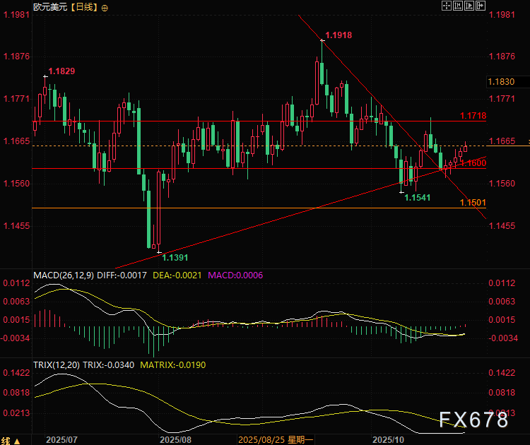 汇通财经APP讯——周二(10月28日)欧元兑美元继续反弹,汇价已经连续第五个交易日走高,由上周1.1580的低点攀升至1.1650附近。欧元持续升值,一度突破1.1650,创下一周以来的新高。尽管上涨势头仍显脆弱,在1.1670和1.1730处面临阻力,但美中贸易关系出现缓和迹象、美国与日本达成协议,以及市场对美联储周三进一步降息的预期,共同推高了风险偏好,令避险属性的美元承压,对欧元形成了支撑。
