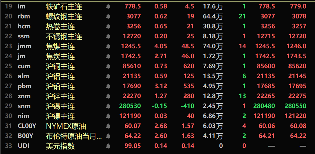 黑色系均飘红,铁矿涨0.58%,螺纹涨0.62%,热卷涨0.65%,不锈钢涨0.2%。双焦方面:焦煤主力合约涨4.05%,焦炭主力合约涨2.71%。