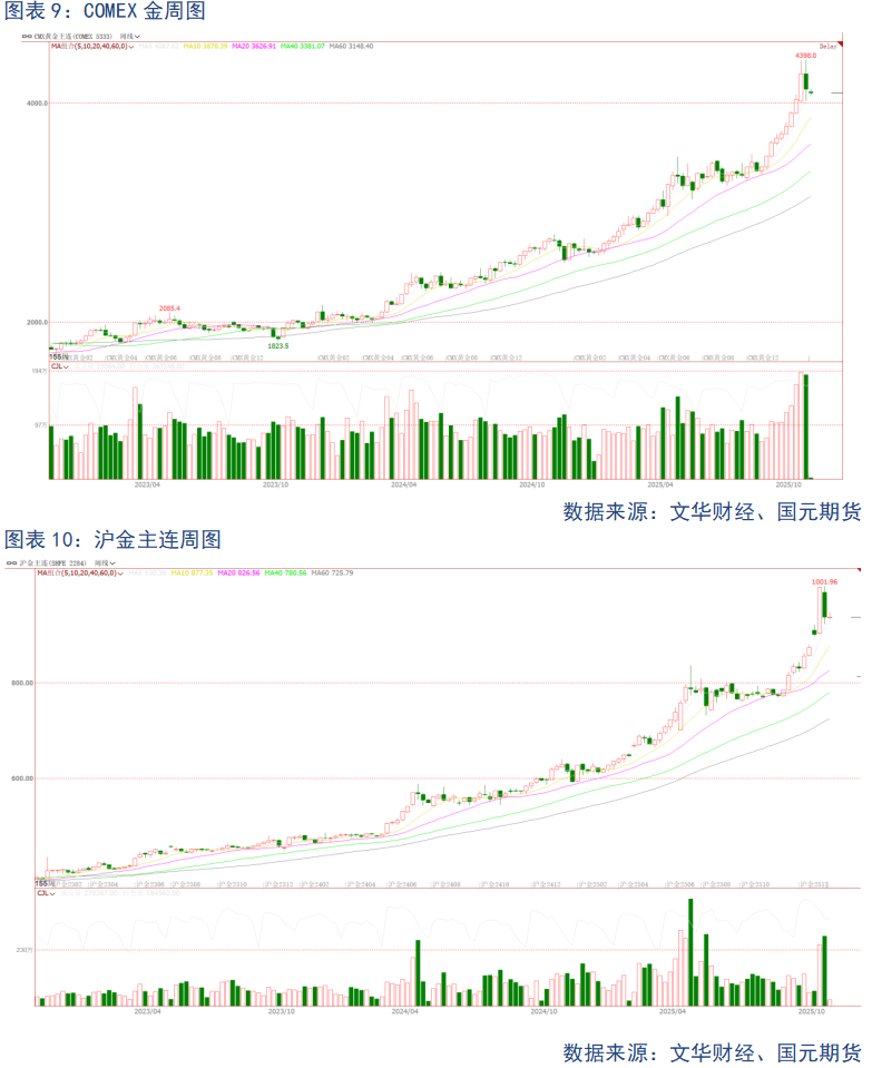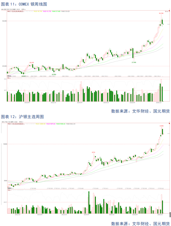 从技术面分析,黄金和白银均处于强势上升趋势。黄金方面,COMEX黄金与沪金周线图呈现均线多头排列,价格沿均线稳步攀升,量价配合显示资金入场积极,尽管短期或有回调,整体多头方向明确;白银方面,COMEX白银和沪银周线图同样均线多头排列,价格上升斜率陡峭,成交量在行情关键阶段同步放大,虽波动或大于黄金,但上升趋势结构未被破坏,整体亦以多头为主。综上,黄金和白银的技术走势均指向多头方向。