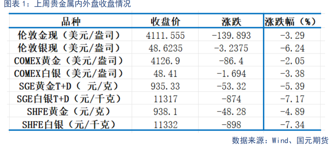 本周贵金属市场全线上涨,外盘伦敦金银分别跌3.29%和6.24%,COMEX金银跌2.05%和3.38%;内盘SGE金银T+D分别跌5.39%和7.17%,SHFE金银跌4.89%和7.34%,市场看空情绪较浓。