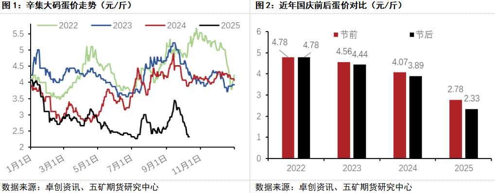 节后蛋价表现明显弱于预期,尽管绝对位置偏低,但节日期间的跌幅依旧创出多年同期最大。现货在节后的低点接近梅雨季低点,且趋势偏弱,传统国庆后补库的预期落空后市场悲观情绪延续,节后盘面低开后继续增仓大幅下跌,近月跌幅尤甚。据卓创,当前辛集大码蛋价为2.33元/斤,接近今年6月底梅雨季创出的低点2.27元/斤,较节前下跌0.45元/斤。16、17和20年同为熊市年份,其国庆节前后跌幅分别为0.01元/斤、0.05元/斤和0元/斤,显著低于今年;与22-24年分别为0元/斤、0.32元/斤和0.18元/斤的节前节后跌幅相比,今年也明显偏大。