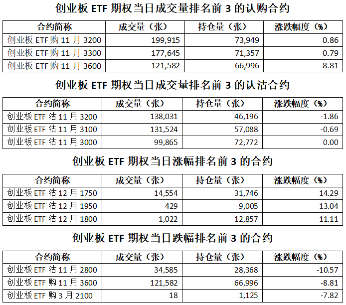 创业板ETF期权总成交面额565.74亿元,减少6.77%,期现成交比为0.24,权利金成交额16.10亿元;期权总成交量1,804,974张,减少7.52%,其中认购期权成交量971,650张,认沽期权成交量833,324张,认沽认购成交比率为0.86(上一交易日认沽认购成交比率为0.75)。