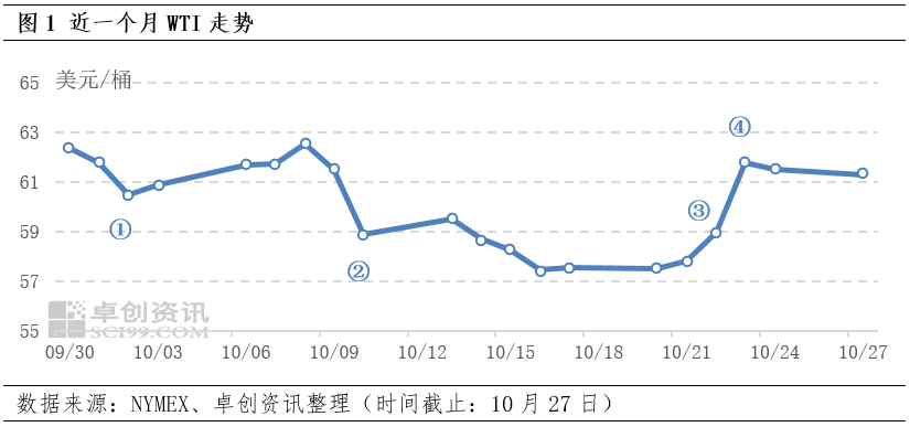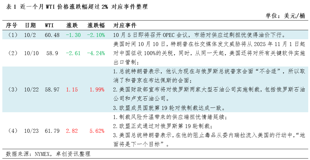 2025年10月,国际油价先抑后扬,月均价进一步下移。截至10月27日,本月美原油均价59.99美元/桶,环比下跌5.57%,同比去年同期价格下跌16.09%;Brent原油月均价63.77美元/桶,环比上月下跌5.64%,同比下跌15.33%。根据10月驱动油价变动的主要事件(图1和表1),供应过剩压力叠加中美关税风险升温利空拖累后,制裁与宏观利好接连登场,油市再度回归中长期过剩与短期利好博弈的震荡区间。