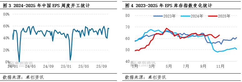 供应端来看,虽然国庆假期间,EPS装置出现集中降负甚至短停现象,行业整体周度开工负荷跌破40%至39.75%,但由于缺乏成交量配合,并未对价格形成明显助力。假期后,随着装置陆续复工且稳定产出,行业整体开工负荷再度出现修复提升。虽然部分企业存在结构性库存低位,但由于缺乏成交量配合,整体现货供应依然偏充裕,并未有明显缺货现象出现。需求端来看,国庆假期后,受阴雨天气较多、气温下降等因素所累,EPS行业建筑保温市场“赶工期”需求量释放不足。虽然月下旬成本低位反弹刺激买涨情绪升温,市场新单成交阶段性放量,但持续性不足。另外,随着气温下降,东北、西北地区需求渐入淡季,部分下游制品企业开始降负甚至停产,整体需求量呈现收缩趋势。从图4中也可窥见一斑,近期EPS库存指数处于近三年同期高位。