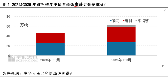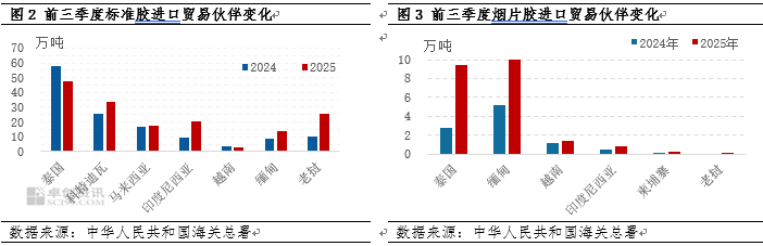 此外,自缅甸、老挝进口标准胶、烟片胶增量明显,自老、缅、柬进口胶种主要为标准胶、烟片胶跟混合胶,呈现标准胶、烟片胶进口量激增。同比来看,增量主要来自于自老挝进口的标准胶(标二),以及从缅甸进口的标准胶(SCRWF)、烟片胶(缅一、缅三)。主要原因在于标准胶、烟片胶执行0关税政策,进口成本面下降支撑进口量增长。据中华人民共和国海关总署公布数据显示,以标准胶来看,2025年中国前三季度自缅甸进口13.86万吨,同比增长4.83万吨,涨幅54%;自老挝累计进口25.9万吨,同比增长15.74万吨,涨幅155%。烟片胶来看,自缅甸累计进口10.39万吨,同比增长5.16万吨,涨幅99%;自柬埔寨累计进口0.21万吨,同比增长91%。