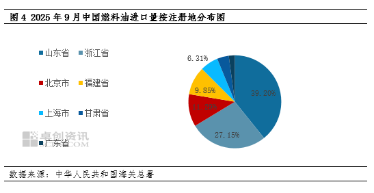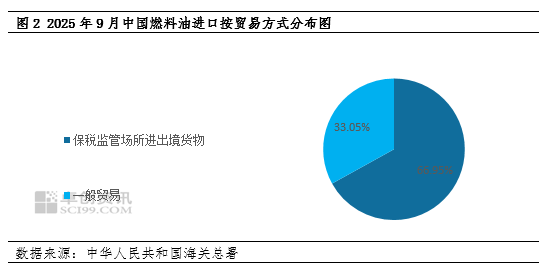 从贸易方式来看,2025年9月中国燃料油进口一般贸易货物39.92万吨,占比为33.05%,环比减少0.43万吨或1.07%。进口保税监管场所进出境货物162.49万吨,占比为66.95%,环比增加57.14万吨或54.24%。