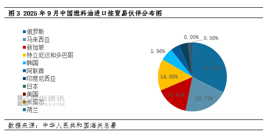 海关数据显示,2025年9月中国进口燃料油来源地前三位分别是俄罗斯、马来西亚、新加坡。俄罗斯居于首位,来自俄罗斯的燃料油进口量为65.69万吨,占比为32.45%,环比增加20.52万吨或45.43%。马来西亚位于第二位,燃料油进口量为41.96万吨,占比为20.73%,环比增加10.44万吨或33.12%。新加坡排在第三位,燃料油进口量为31.19万吨,占比为15.41%,环比增加16.68万吨或114.96%。