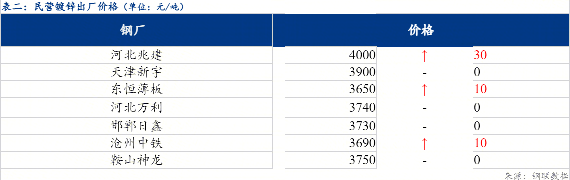 今日北方民营钢厂镀锌出厂指导价在3650-4000元/吨。