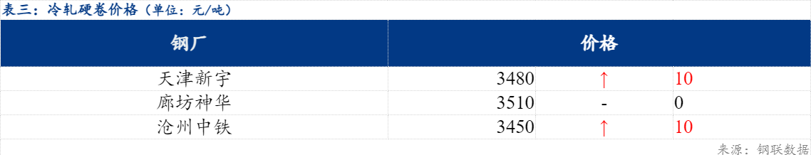 今日北方市场冷轧基料3.0*1010*CSPHC河北普阳价格为3260元/吨,较上一期价格上涨20元/吨,河北纵横价格为3290元/吨,较上一期价格上涨30元/吨。镀锌方面,今日北方市场价格部分上涨10-30元/吨;轧硬方面,当前主流报价3450-3510元/吨。市场方面,受宏观利好消息影响,现货市场看涨情绪增加,整体仍受需求表现偏弱影响出货量有增但实单成交价格未能涨上去。
