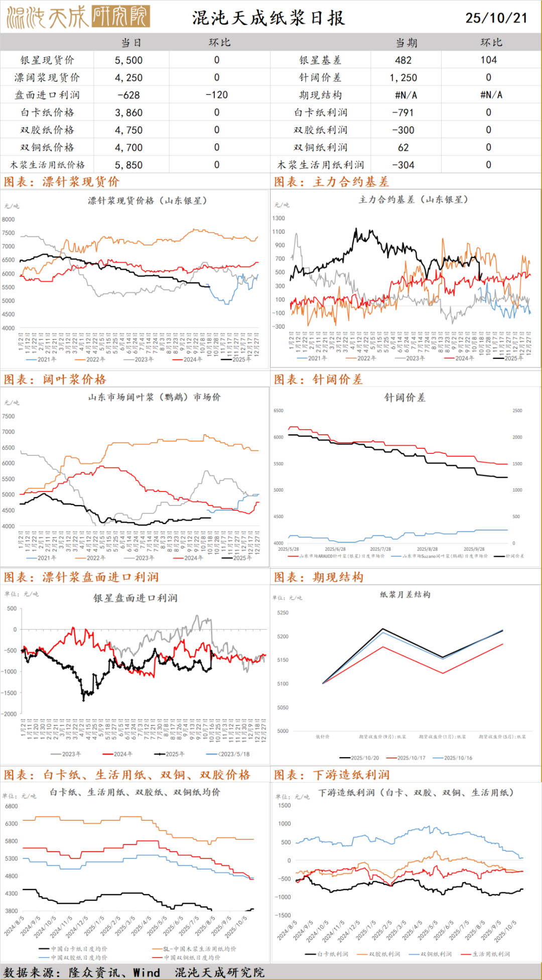 纸浆:昨日国内针叶浆现货稳定,银星5500元/吨(0),俄针5100元/吨(0);阔叶浆现货稳定,金鱼4250元/吨(0);针阔叶浆价差1250元/吨(0),现货市场交投一般;白卡纸市场受个别纸厂货源紧俏影响,贸易商低价惜售,涨价较为积极,下旬白卡纸市场行情延续稳中上行局面;生活用纸市场价格稳盘整理为主,整体交投氛围仍属平淡;文化用纸市场新增装置生产逐步趋稳,市场货源供应充裕;受海外浆厂减产预期影响,盘面反弹,随后横盘震荡,持续上涨动力较弱;行业基本面没有明显改观,需求改善不显著及旺季不旺,下方有成本支撑,关注纸厂补库和政策影响持续性,远期合约不宜过度看空。