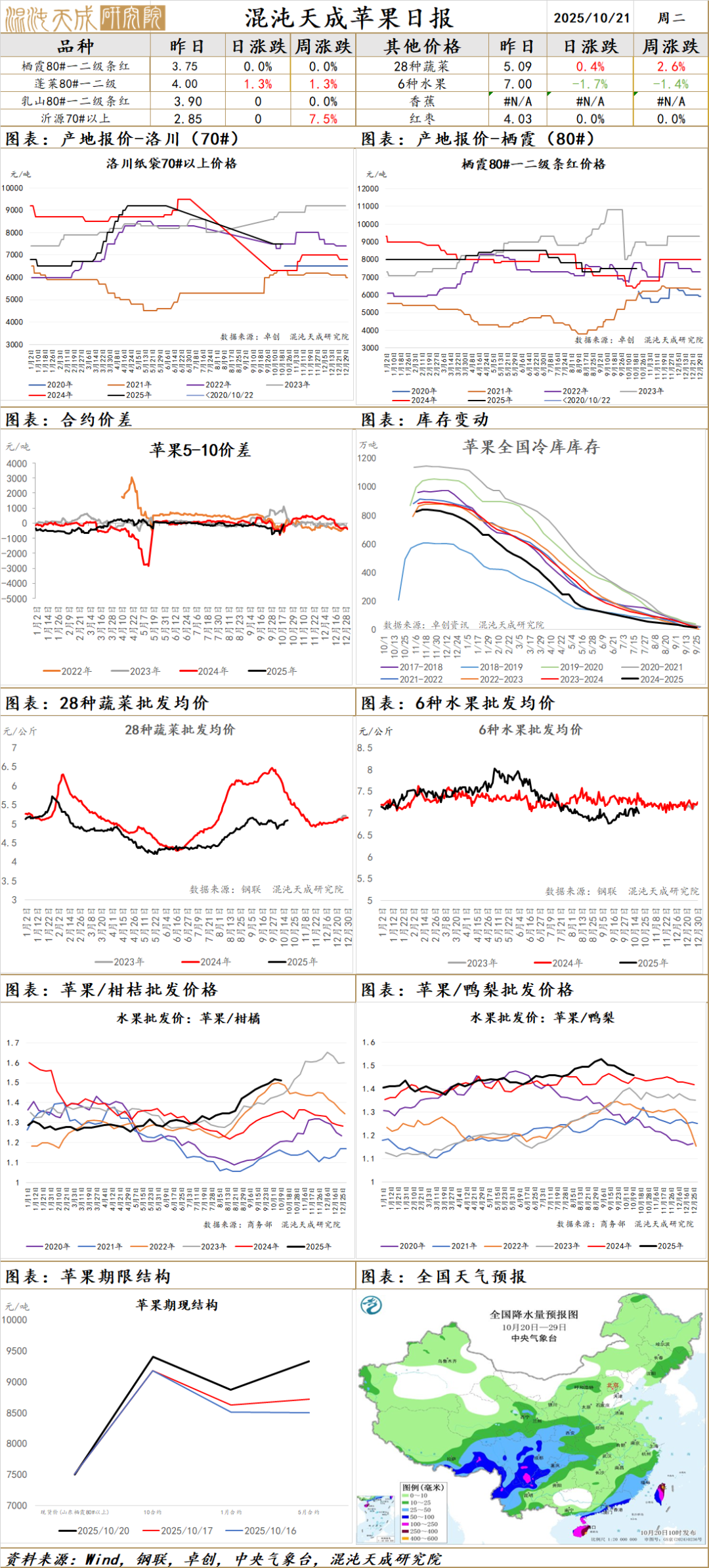 苹果:山东产区库存苹果晚熟纸袋富士开始收购,客商采购报价高于去年,当前新季纸袋富士80#以上一二级半货源3.2-3.5元/斤,统货主流价格2.6-3.0元/斤,一二级货源3.5-4.0元/斤,收购难度比较大,上量较少;陕西产区主流订货价格稳定,客商主要选购优质好货,低质量货源采购偏谨慎。当地好货多数已经被订购,有低价位成交货源,质量不及前期订购货源,洛川产区近期70#起步主流订货价格3.5-4.0元/斤,好货4.0-4.5元/斤,以质论价;目前处于供应端交易的最后验证时刻,利多因素集中发酵,卓创下调新季产量至3423万吨,同比下降8.34%,市场对于后期存储苹果质量担忧加剧,预计短期基本面仍偏强,但考虑到国内整体消费表现仍一般,预计01合约9000元/吨以上有一定压力,后期关注收购价格的变动和入库情况。
