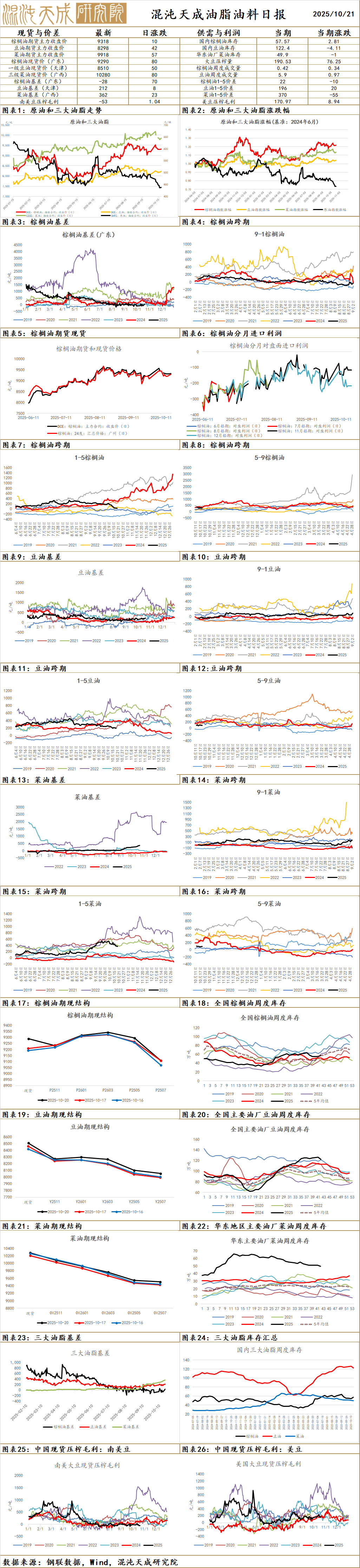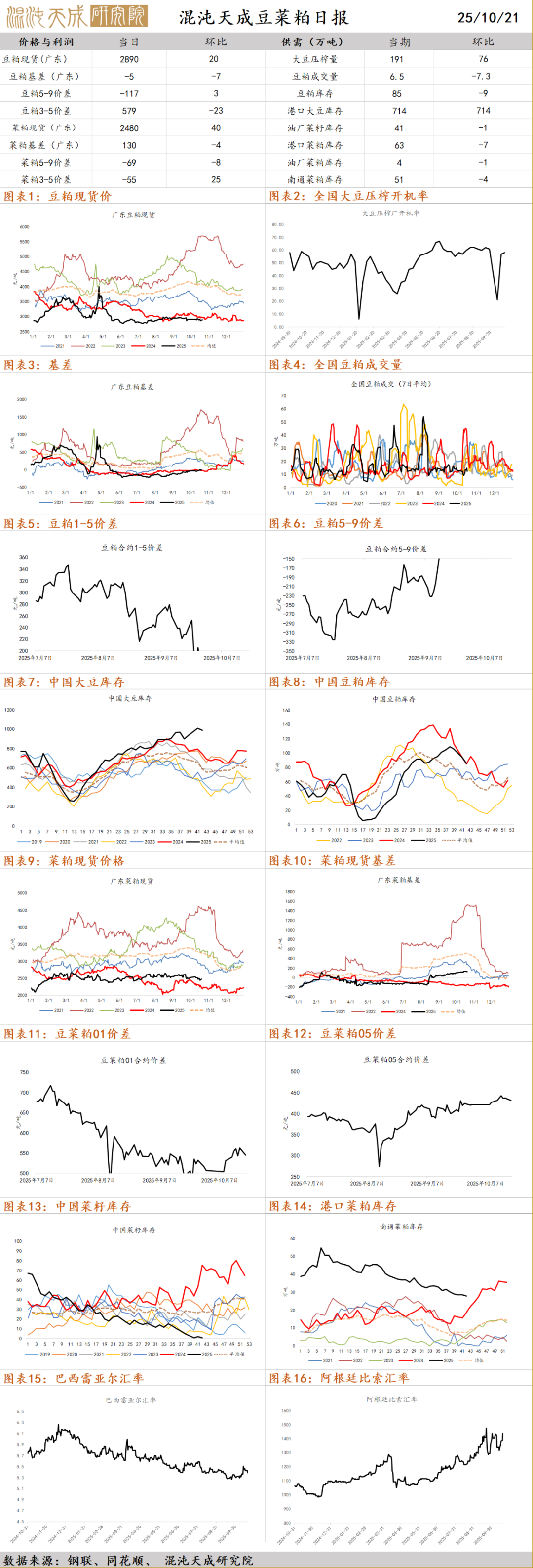 供给端:加拿大外长阿南德定于10月16日至17日访华;预计10—11月菜籽到港规模有限;澳大利亚24/25菜籽旧作产量由6月份的610万吨上调至640万吨,25/26新作产量由6月份的571万吨上调至645万吨;商务部公告2025年第45号公告延长对原产于加拿大的进口油菜籽反倾销调查期限至2026年3月;中国与澳大利亚签署关于实施和审议中澳自贸协定的谅解备忘录,对远月供应紧张预期有所改善。