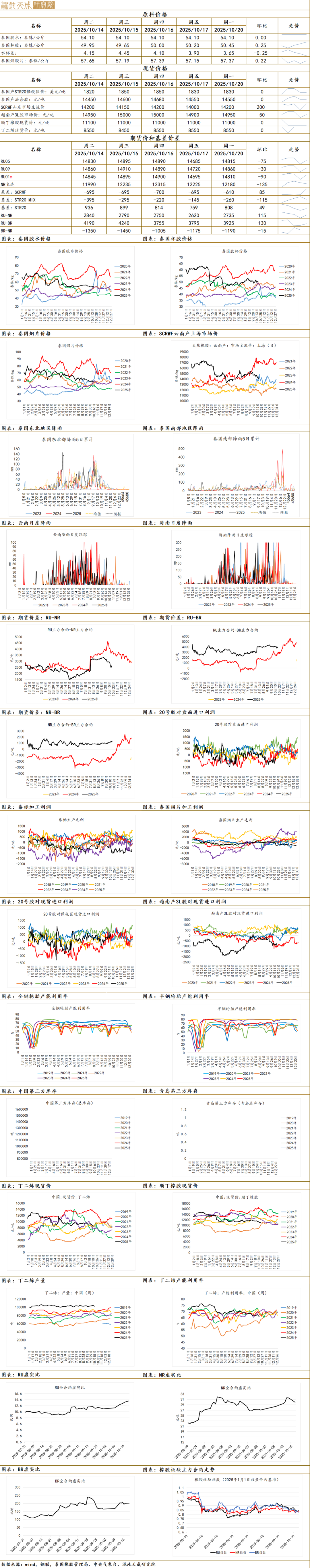1.机构消息:据隆众资讯统计,截至2025年10月19日,青岛地区天胶保税和一般贸易合计库存量43.75万吨,环比上期减少1.86万吨,降幅4.07%。保税区库存6.96万吨,降幅1.70%;一般贸易库存36.79万吨,降幅4.51%。(隆众资讯)
