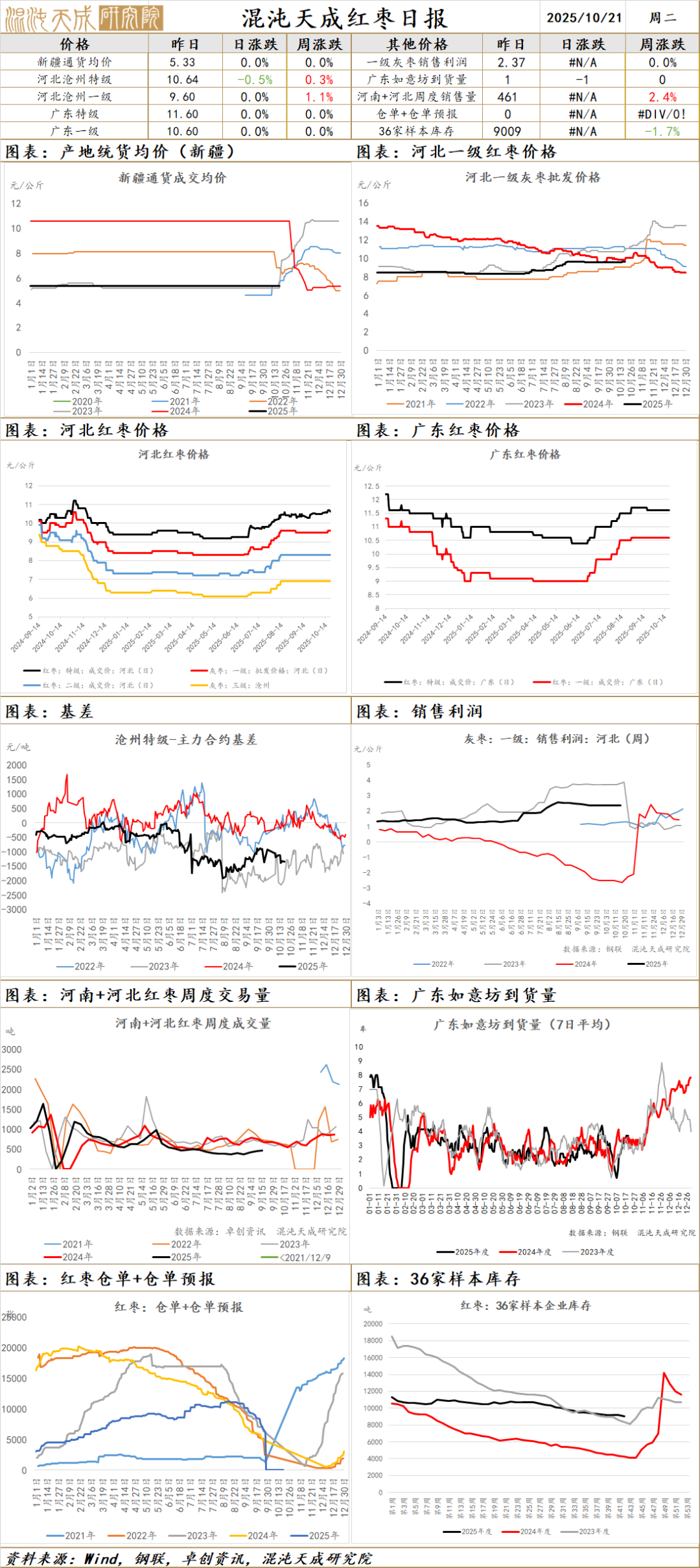 河北崔尔庄市场停车区到货3车,市场到货新季免洗红枣,新货售罄,关注新季上市后价格变化;广东如意坊市场到货4车,部分货源质量一般持货商小幅让利;产区陆续收购,枣园签订价格不一,盘面高位震荡,对开称价的博弈仍在继续,供需整体维持偏空看待,红枣维持下树前后逢高空的策略。
