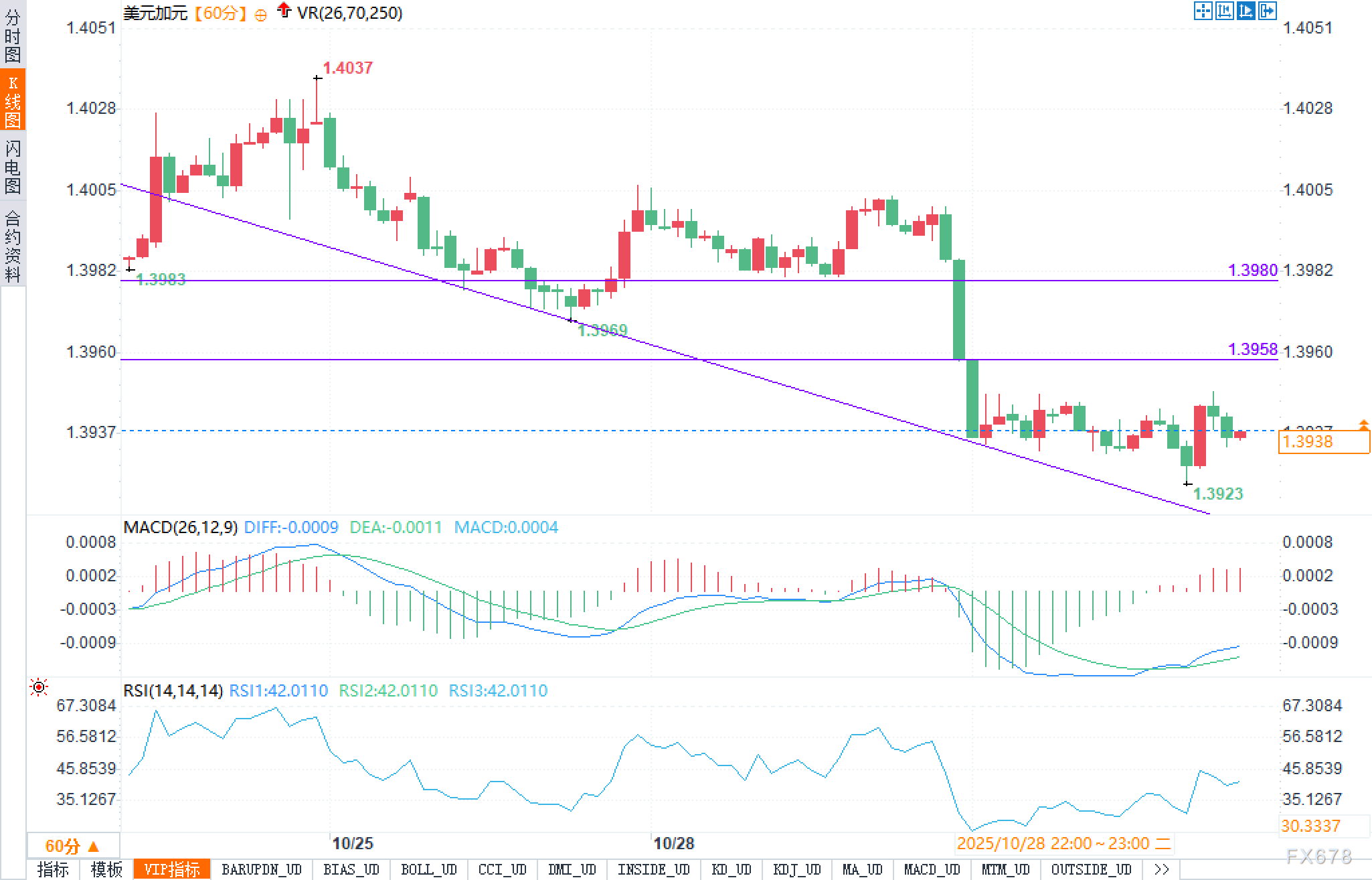 小时图显示,汇价自1.4037回落并沿下降趋势线运行,长阴一举跌破1.3958这一静态水平,最低回踩至1.3923后止跌,当前围绕1.3940整理。图中两条紫色水平线分别标注1.3980与1.3958,前者为短线第一阻力;后者已由支撑转为阻力。斜向趋势线与价格在1.3960附近相交,阻力效应明显。