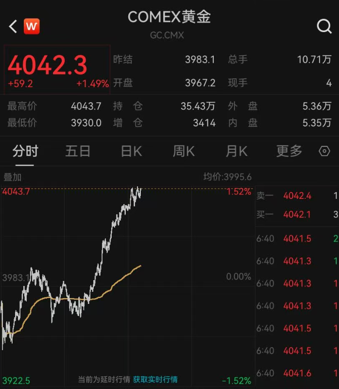 经历一轮跌势后,10月29日午后,国际黄金出现大涨。截至发稿,现货黄金大涨1.85%,报4025美元/盎司;COMEX期货黄金涨1.49%,报4042美元/盎司。