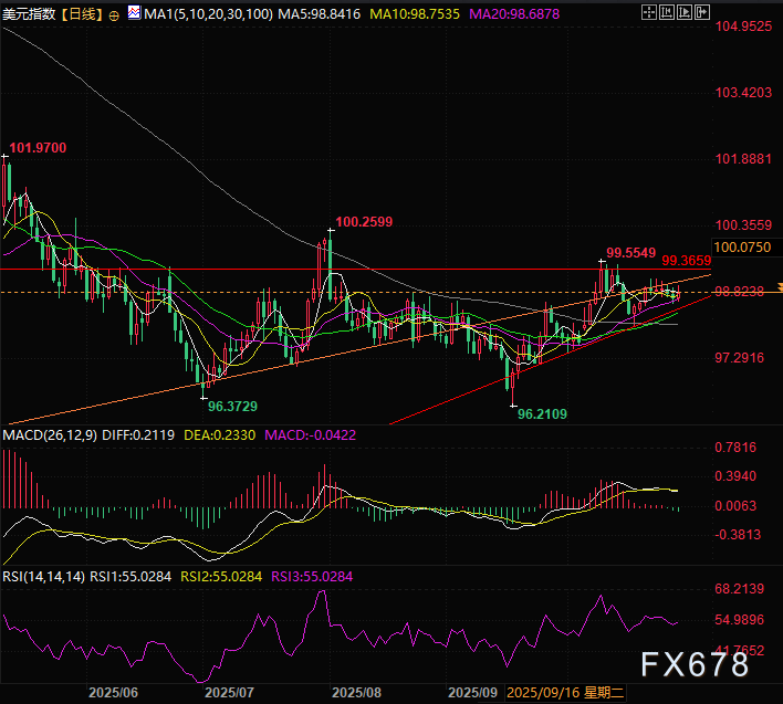 汇通财经APP讯——周三(10月29日)美元指数走出探底回升走势。面对美联储大概率降息美元指数近期调整一直维持在20天线以上,展示出了美元的韧性,目前交投于98.81附近。