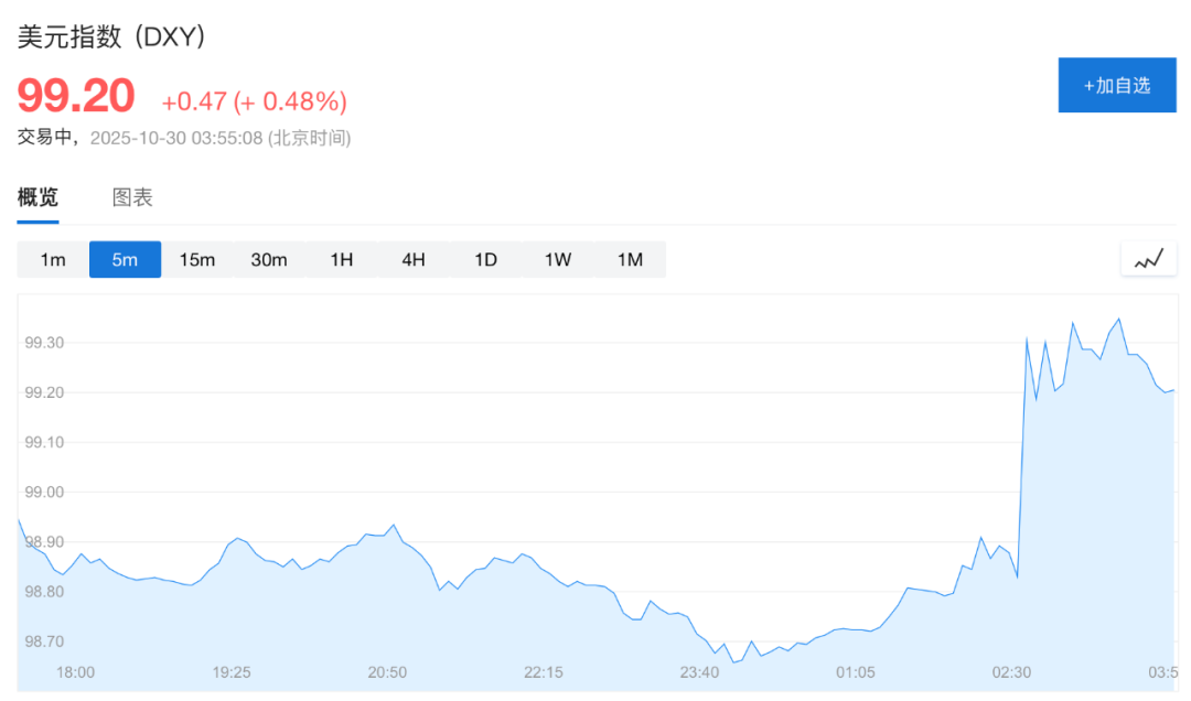 美元指数直线拉升,由跌转涨,现涨0.48%,报99.2。