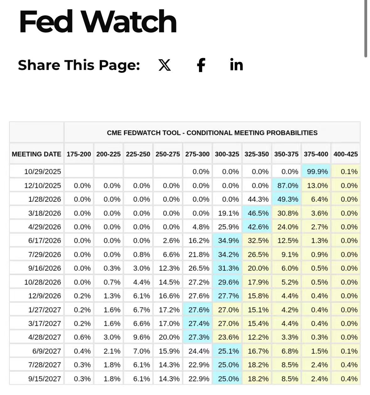截至北京时间10月30日,CME“美联储观察”工具显示,美联储12月再次降息25个基点的概率已从此前的95%降至87%。明年1月美联储累计降息25个基点的概率则仅为49.3%。