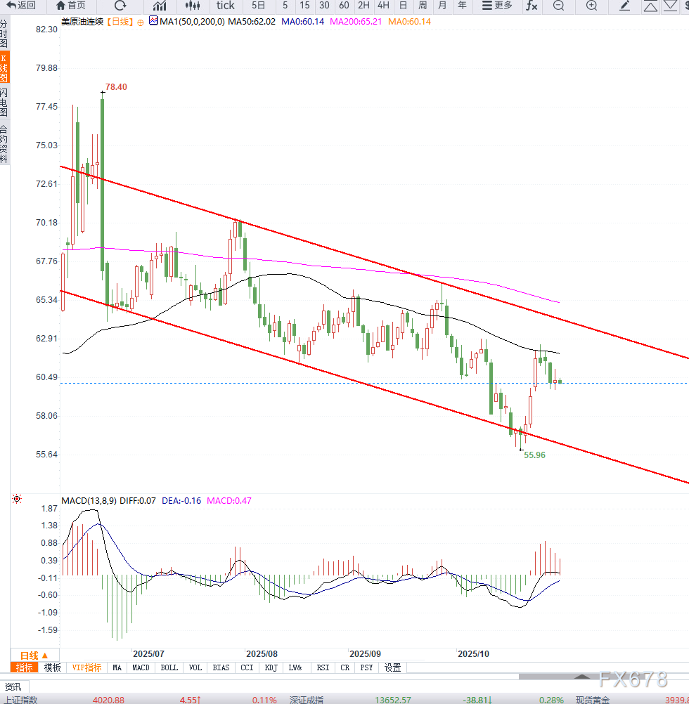 从日线走势来看,WTI原油在经历连续三日下跌后于60美元关口获得支撑,技术面出现反弹信号。价格重新站上短期5日均线,MACD指标形成底部金叉,显示短线反弹动能正在积聚。