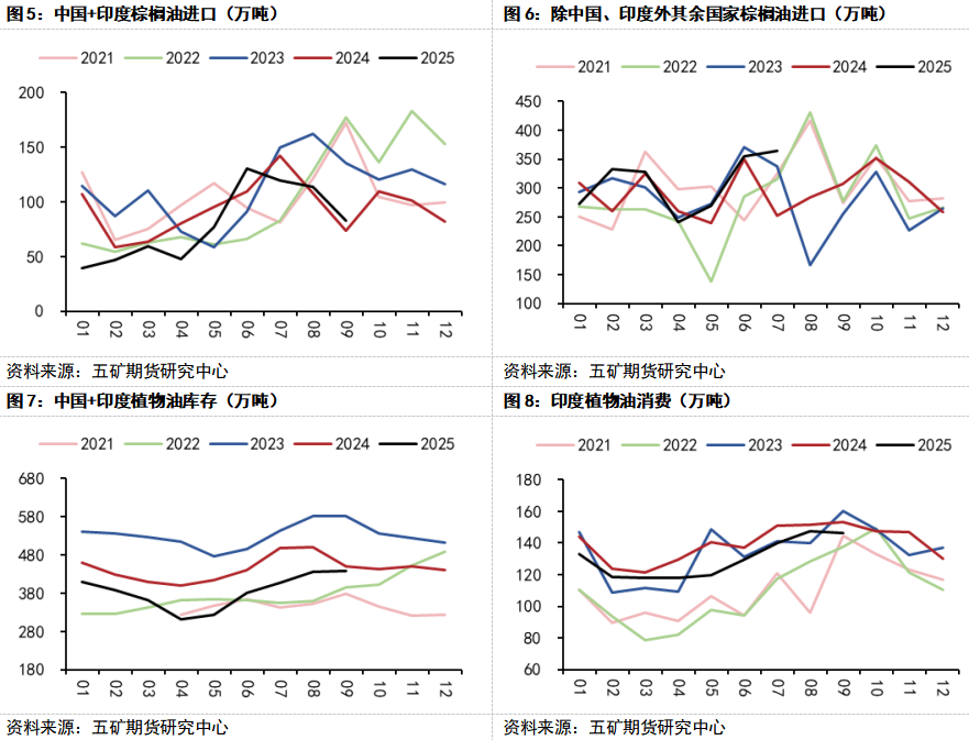 中国、印度两国的棕榈油进口需求今年均有所下降。2025年1-9月,中国棕榈油进口同比下降30万吨。2025年8、9月,印度分别进口棕榈油99.05、82.9万吨,低于市场预期,往年印度在9月通常大量备货棕榈油应对排灯节,但今年由于国际豆油供应较多,印度转而购买了较多豆油,棕榈油进口需求下降,2025年1-9月,印度棕榈油进口同比下降约72万吨。