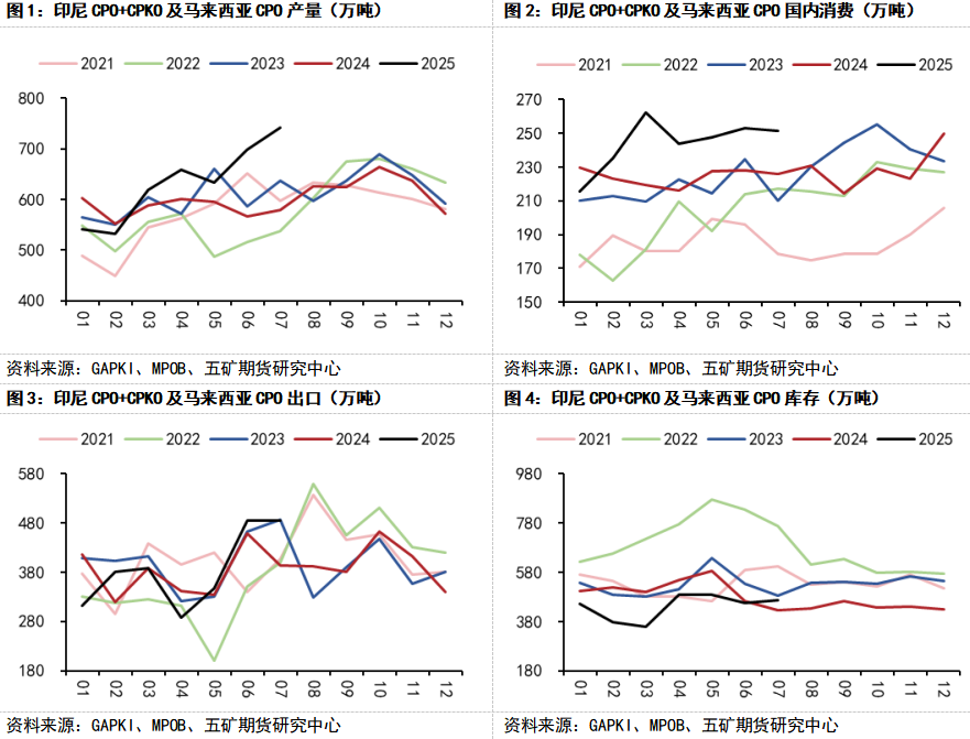 印尼当前棕榈油产量处于近年最高水平。据GAPKI 7月棕榈油月报数据显示,截至7月底印尼棕榈油库存录得253万吨环比增加3.8万吨,印尼7月棕榈油出口达353.7万吨环比6月下降7万吨,7月棕榈油产量达560.6万吨环比增加31.7万吨,单月产量创近十年最高水平。叠加马来西亚7月数据,马来西亚及印尼7月共出口棕榈油(印尼数据含棕榈仁油)484.6万吨,产量为741.8万吨,国内消费为251.56万吨,均为近五年同期最高水平,库存为468万吨,处近五年第二低水平。