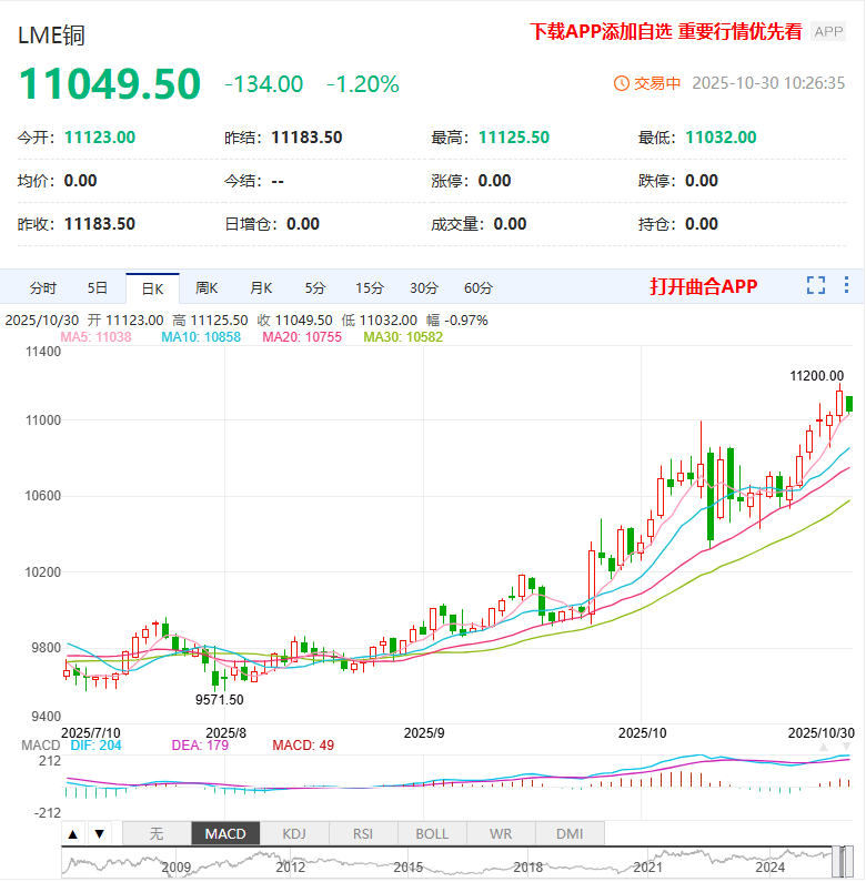 本周三,全球矿山供应紧张加剧,伦敦金属交易所(LME)期铜创下历史新高,本月迄今伦铜上涨8.86%,今年迄今上涨27.38%。截止今日发稿,LME铜报11049.50美元/吨,震荡回落1.20%。