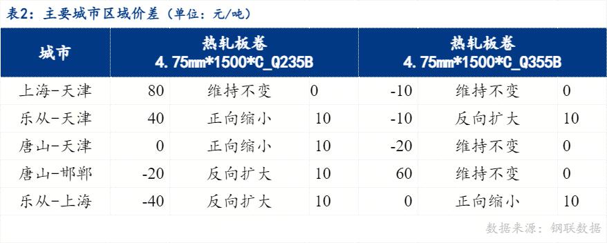 从区域价差来看,4.75mm普卷华南与华北价差40元/吨,华东与华北价差80元/吨,华南与华东价差-40元/吨。京津冀地区价差来看,唐山与天津价差0元/吨,唐山与邯郸价差-20元/吨 。